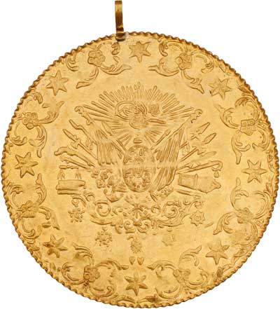 500 Piastr AH.1293, 25.rok vlády (= 1900), lehký odražek luxusní ražby pro reprezentativní účely, typ jako KM.746, ale hmotnost pouze 18.052g, ouško