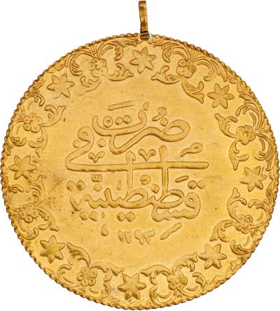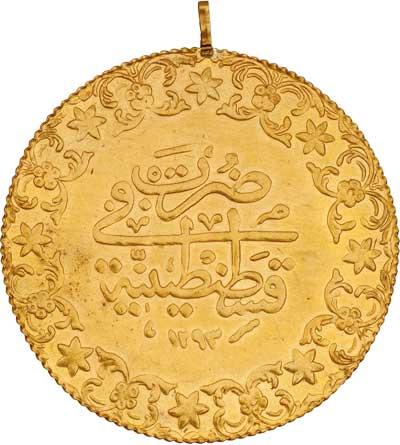 500 Piastr AH.1293, 25.rok vlády (= 1900), lehký odražek luxusní ražby pro reprezentativní účely, typ jako KM.746, ale hmotnost pouze 18.052g, ouško