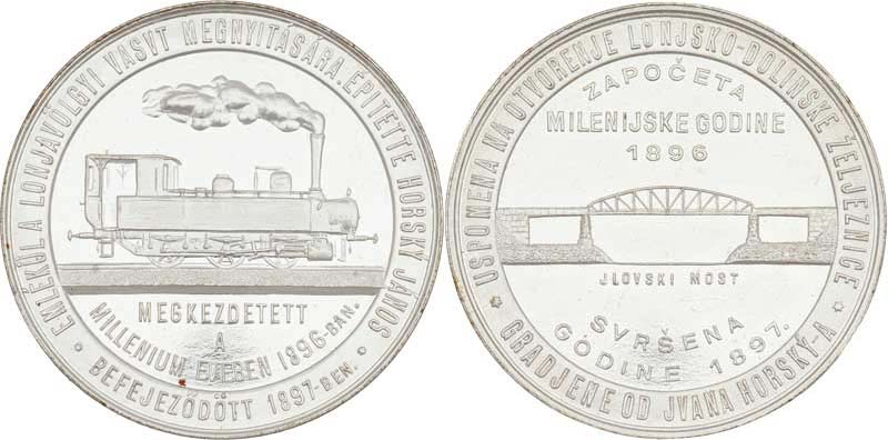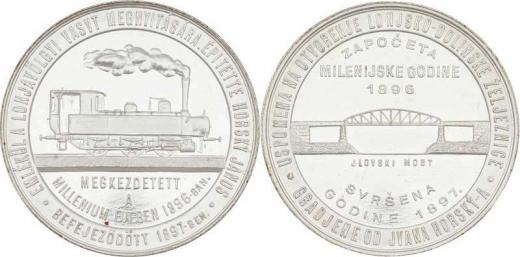 J.Horský - otevření Lonjskodolinské železnice 1897 - lokomotiva zprava, maďar.nápis a opis /most, chorvat. nápis a opis, Nesign., postř.bronz 40mm, H.7349 R!
