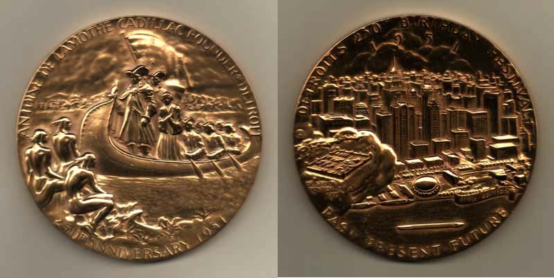 Ant. de Lamothe Cadillacc - 250 let Detroitu 1951 - setkání Francouzů s indiány, opis / velkoměsto, opis, Sign., zlacený bronz 72 mm, dvě dírky v hraně, etue