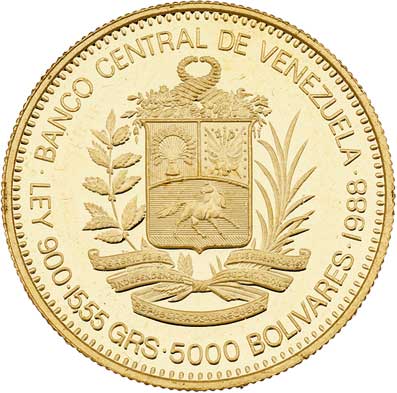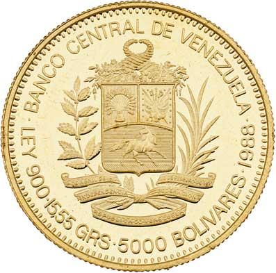 5000 Bolivares 1888 - Rafael Urdanea, Y.62 (Au900, pouze 25.000 ks), 15.546g, nep.hr., nep.rysky