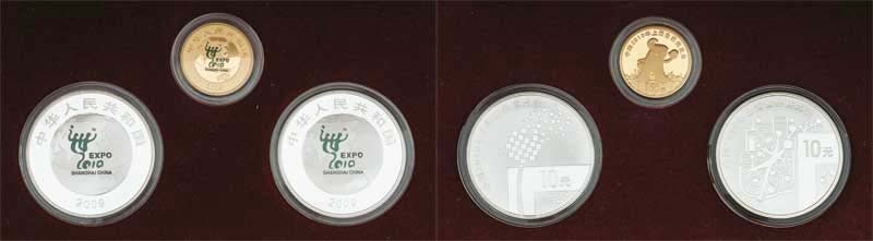 Sada pamětních mincí 2009 - Expo Shanghai - 150,10,10 Yuan, KM.1906 (Au999, 10.35g), KM.1907,1908 (Ag999, 31.11g), 3xkapsle, 3x certifikát, spol.etue, přebal