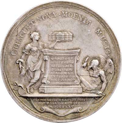 Donner - založení Rytířské akademie v Lehnici 1735 - poprsí zprava, opis / bohové s modelem budovy, písmo, Sign., Ag 51mm, 52.548g, ČS.1144, dr.rysky, patina R!
