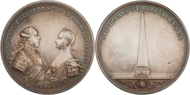 Oexlein - AR medaile na svatbu ve Vídni 23.1.1765 - dva portréty, opis / sloup, znak, opis, Sign., Ag 45mm, 21.842g, M.1936, H.3134, úhoz, dr.rys., pat.