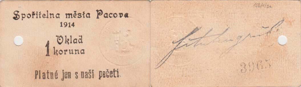 Pacov - Spořitelna, 1 Koruna 1914, D-H.156/1.2a, papír vroubkovaný, perf. 1x 5mm