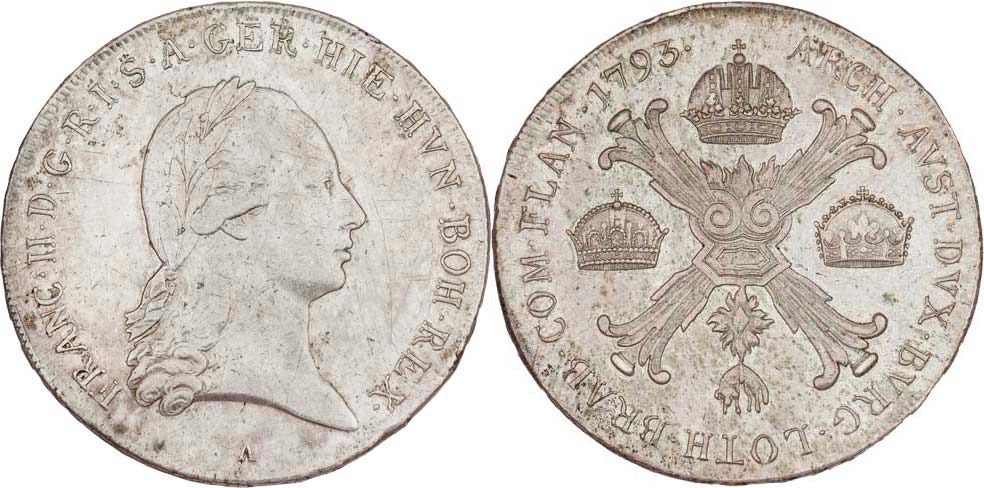 Tolar křížový 1793 A, 29.419g, mírně just., dr.hr., dr.rysky, vlas.škr., patina