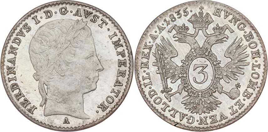 3 Krejcar 1835 A - FERDINANDVS, 1.717g, mimořádná zachovalost - tzv."prvoražba" R!