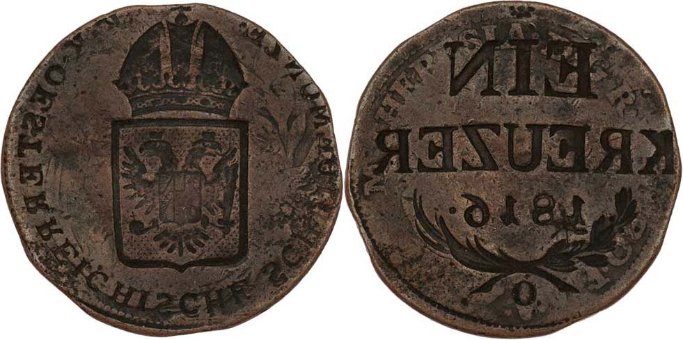 Cu Krejcar 1816 O, Oravica, oboustranný inkus, 6.903g, pěkná patina R!
