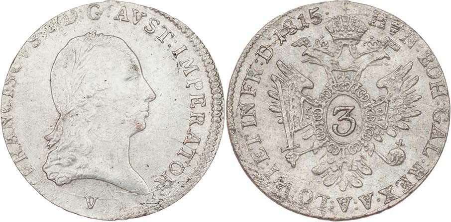 3 Krejcar 1815 V, P.23, 1.825g, dr.vady razidla, exc., nep.just., nep.rysky R!