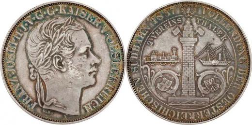 2 Tolar spolkový 1857 A - Jižní dráha - lístky věnce směřují k písmenům "AI" v opisu, celkem raženo pouze 1644ks, 36.955g, hr., vlas.rysky, patina RR!