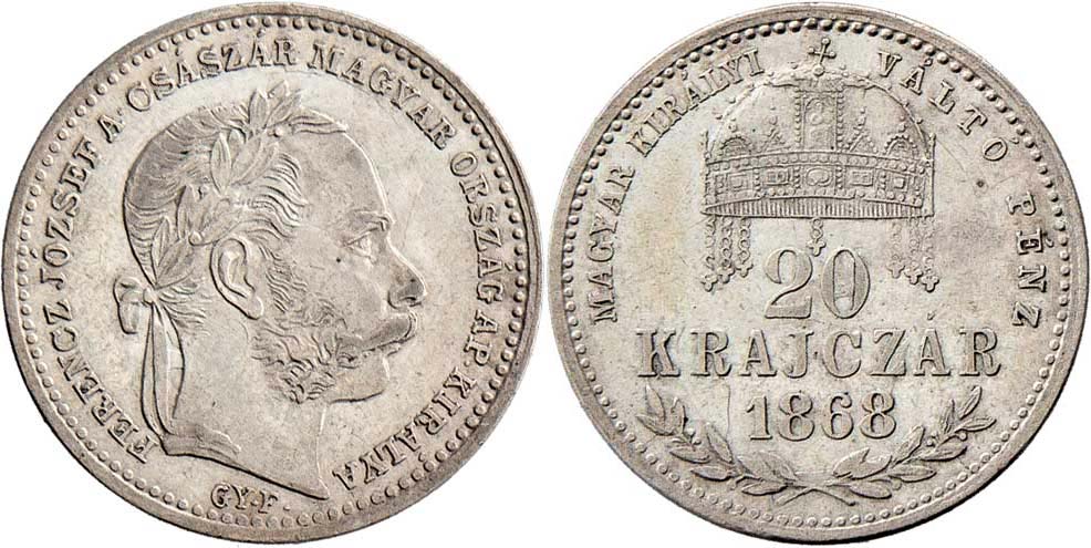 20 Krejcar 1868 GYF - dlouhý opis, 2.576g, dr.vady materiálu, nep.rysky, patina R!