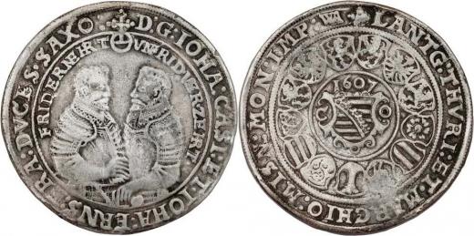 Tolar 1607 WA, Coburg-Albrecht Wolf, Dav.7426, podob. jako FW.III.14606, 28.661g, stopa po oušku, nedor., dvojráz, patina R!