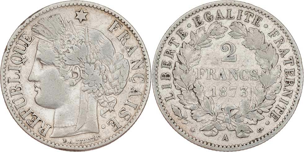 2 Frank 1873 A, Paříž, KM.817.1, 9.883g, nep.hr., nep.rysky, patina