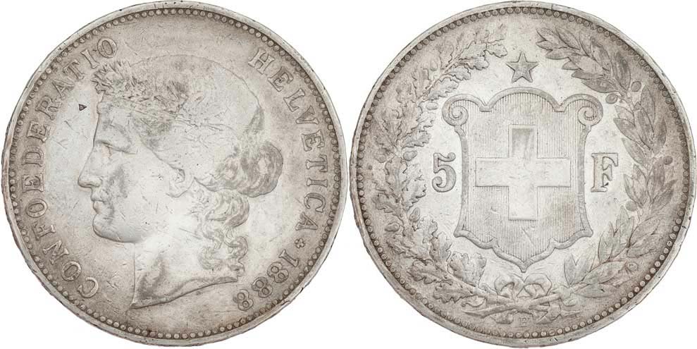 5 Frank 1888 B - hlava Helvetie, KM.34 (pouze 25.000 ks), 24.763g, dr.hr., rysky, patina RR!