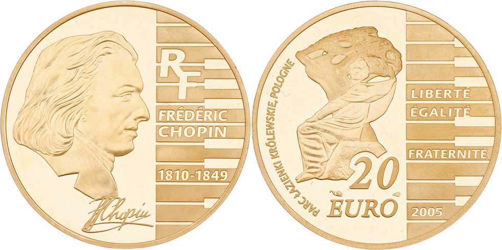 20 Euro 2005 - Frederic Chopin, KM.2028 (Au920, 31mm, 17.00g, pouze 500 ks), kapsle, etue, certifikát RR!