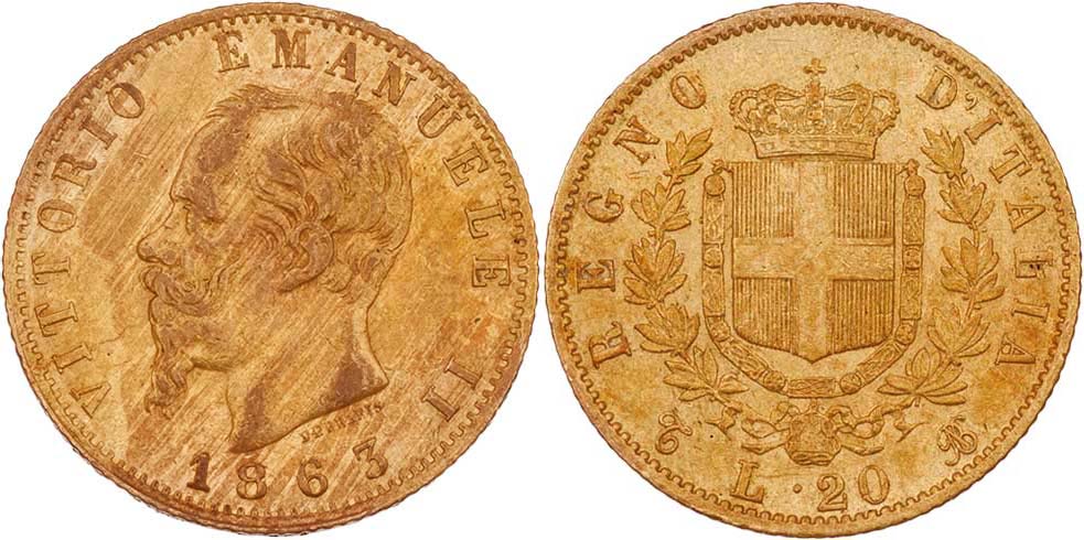 20 Lira 1863 T/BN, Torino, KM.10.1 (Au900), 6.417g, nep.hr., nep.rysky, téměř