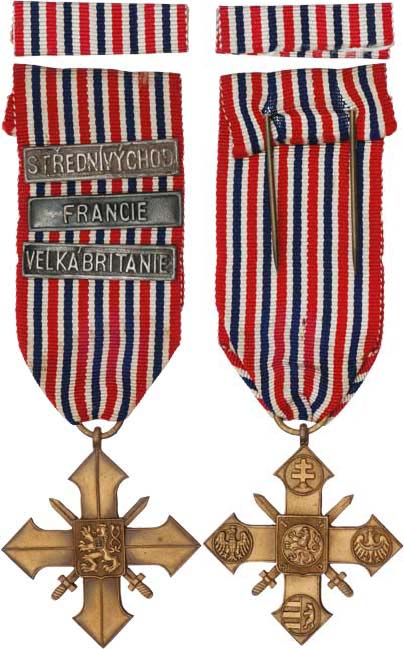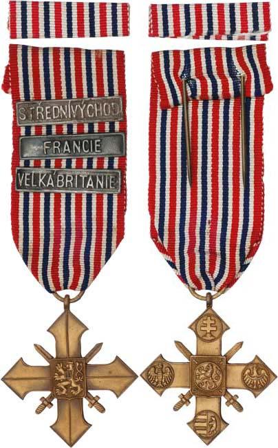 Československý válečný kříž 1939, VM.11-D, 3.pražské vydání z let 1946 - 1948, na stuze štítky "STŘEDNÍ VÝCHOD, FRANCIE, VELKÁ BRITANIE", malá stužka