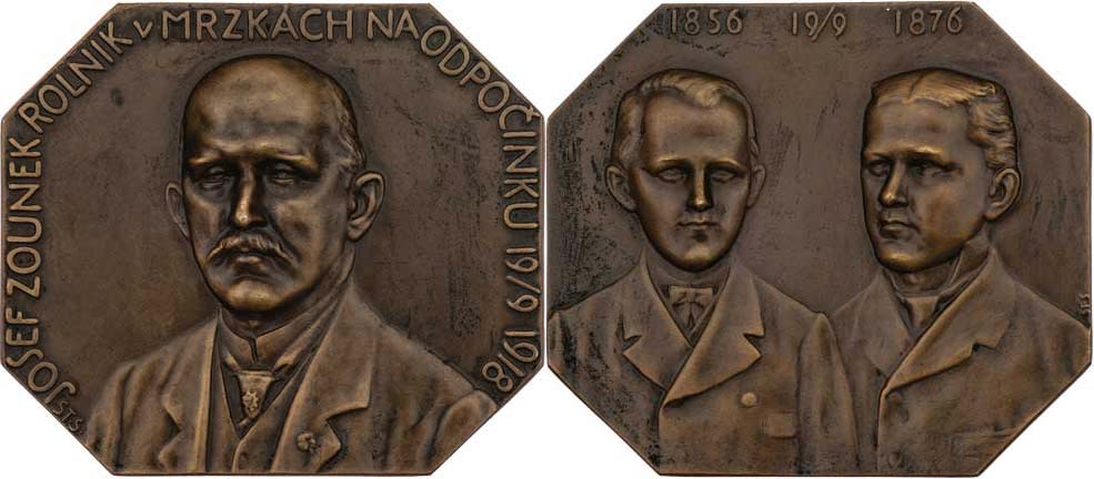 Josef Zounek - rolník na odpočinku 1918 - portrét čelně, opis / dva portréty v mládí (1856 a 1876), Sign., patin. bronzový osmiúhelník 80x70 mm, lakov.