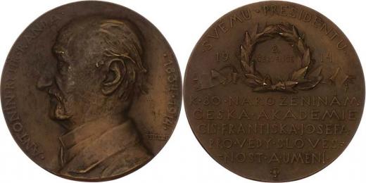 Antonín rytíř Randa - ČAVU k 80.narozeninám 1914 - poprsí zleva, opis / datum ve věnci a 6-řádk. nápis, Sign., patinovaný bronz 60 mm, téměř