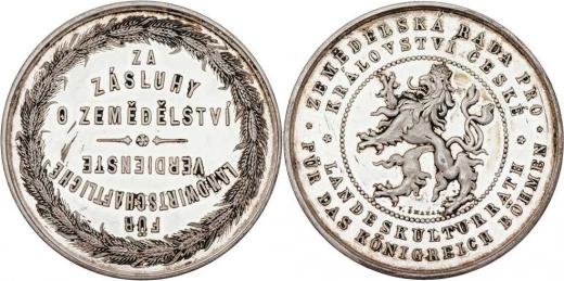 Zeměděl.rada pro Království české - Za zásluhy b.l. - český lev, dvojitý česko-německý opis / česko-německý nápis ve věnci, Sign., Punc., Ag 42mm, 24.010g, lakov