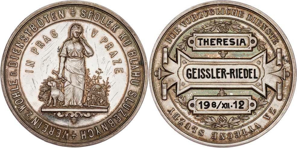 Spolek ku blahu služebných - Th.Geissler-Riedel 1912- dívka s klíčem v ruce, pes a včelí úl, opis / tabulka s věnováním, opis, Ag 47mm, 40.777g, vada raz.,lakov.