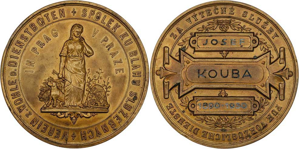 Spolek ku blahu služebných, b.l. (Josef Kouba 1930) - dívka s klíčem v ruce, pes a včelí úl, opis / tabulka s věnováním, opis, zlac. bronz 47 mm, pěkná patina