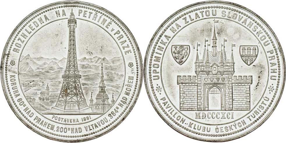 Upomínka na zlatou slovanskou Prahu 1891 - Petřínská rozhledna, opis / výstavní pavilon Klubu čes.turistů, opis, Nesign., cín 54mm, ŠFP.63b, dr.hr., téměř