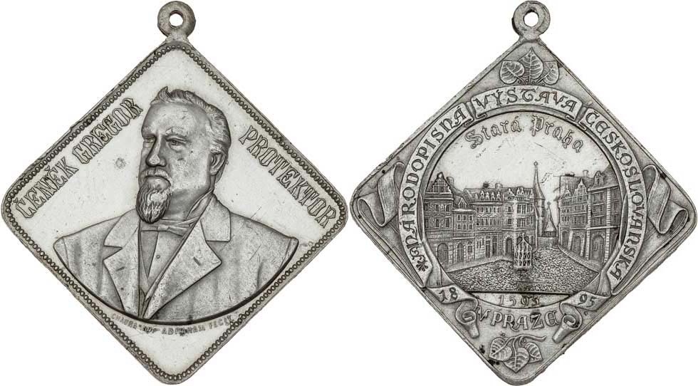 Chaura a Abraham 1895 - Čeněk Gregor, protektor výst. mírně zleva, opis / pohled na Malé náměstí, nápis na stuze, cín 33x33 mm s původním raženým ouškem, téměř