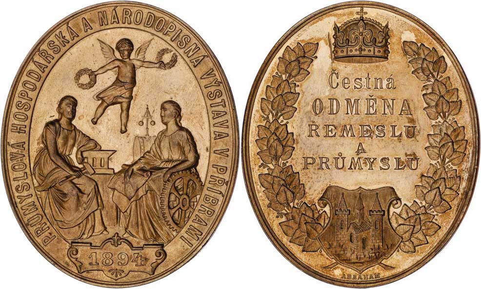 Abrahám - Hospodářská a národopisná výstava 1894 - alegorie, opis / koruna, znak a nápis v lipov.věnci, Sign., zlac.bronz 57/70 mm, nep.hr., dr.rysky, lakov.