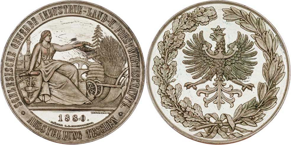 Wetzenmaier/Christlbauer - Slezská zemská výst. 1880 - slezský znak ve věnci / alegorie, německý opis, Sign., postříbřený bronz 58 mm, vl.rysky, pat., etue