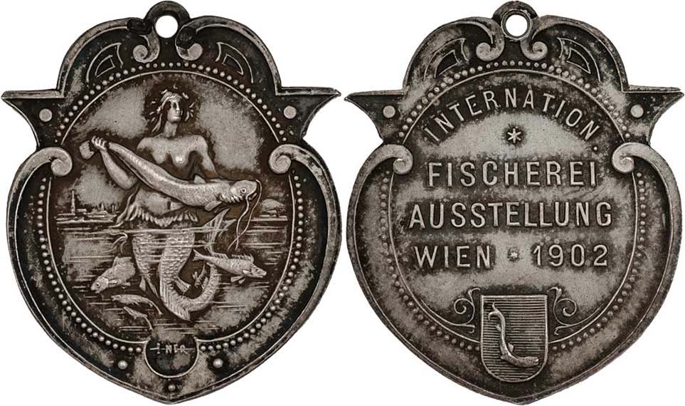 J.Ner - Mezinárodní rybářská výstava 1902 - vodní panna drží sumce/ 4-řádkový nápis, nepravidelný tvar, Sign., Punc., patinov.Ag, 23x28mm, 5.746g, pův.závěs