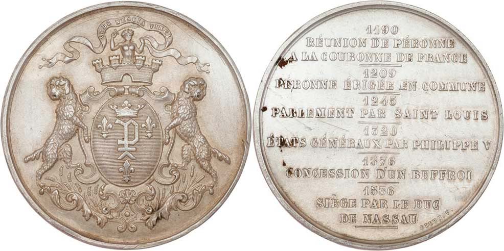Péronne - AR městská pamětní medaile b.l. - korunov. znak města se dvěma štítonoši / data a události z dějin města, Sign.Stern, 45mm, 50.885g, hr., škr.