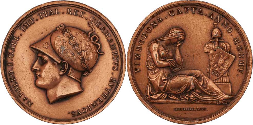 Manfredini - AE medaile na obsazení Vídně 1805 - hlava zleva v přilbě, opis / sedící Austria, trofej, opis, 42mm, 41.922g, Zeitz.0, dr.hr., nep.rysky, tém.