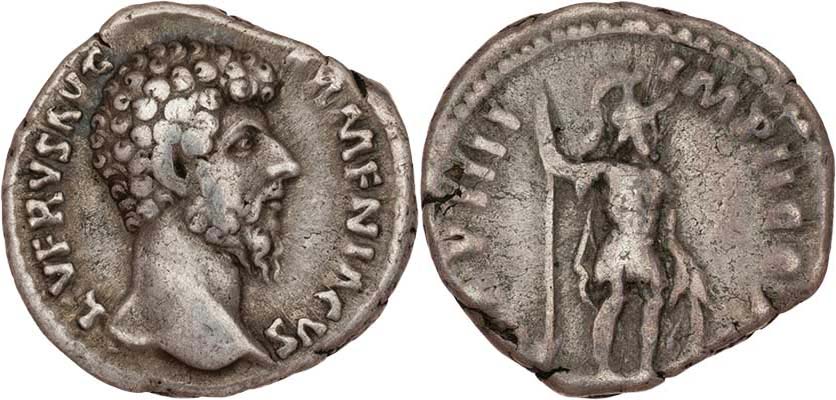 AR Denár, Rv:"TR.P.IIII.IMP.II.COS.II." stojící Mars, S.1440, RIC.515 - minc.Řím - ražba z let 163 - 164, nepravidelný tvar střížku, pěkná patina