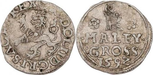 Malý groš 1592, Jáchymov-Hoffmann, HN.8b (opis 7c), nápis ". MALEY ./. GROSS ./. 1592 .", 0.826g, nep.nedor., pěkná patina