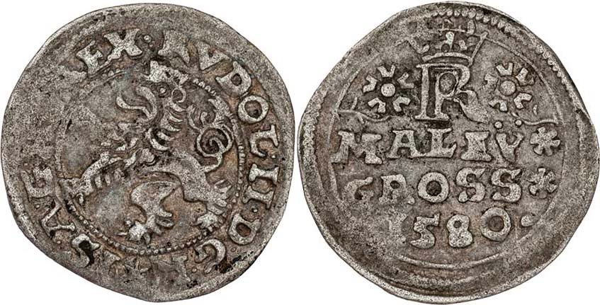 Malý groš 1580, Č.Budějovice-Schönfeld, HN.8 (7c), nápis " MALEY */ GROSS */. 1580 .", 1.031g, nep.nedor., pěkná patina R!