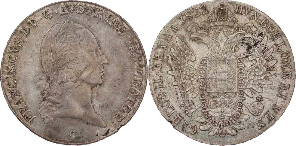 Tolar konvenční 1822 C, 28.032g, vada materiálu v aversu a na hraně, nep.just., patina
