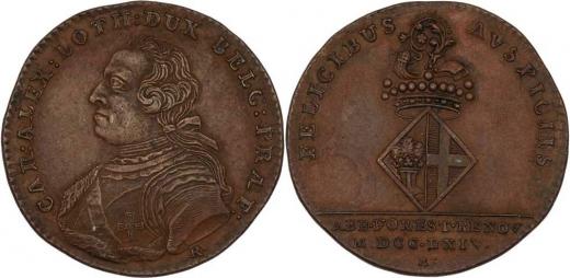 Roettiers - AE pamětní jeton na rok 1764 - poprsí zleva, opis / korunovaný znak, opis a nápis, Sign., Cu 32mm, 12.598g, M.neuv., H.neuv., pěkná patina