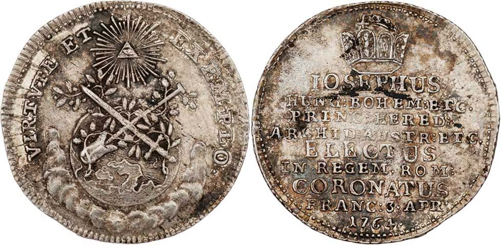 Menší peníz na korunovaci ve Frankfurtu 3.IV.1764 - Boží oko, meč a pluh na zeměkouli, opis / koruna, nápis, Ag 20mm, 1.978g, M.1922, Nov.C.14b, patina