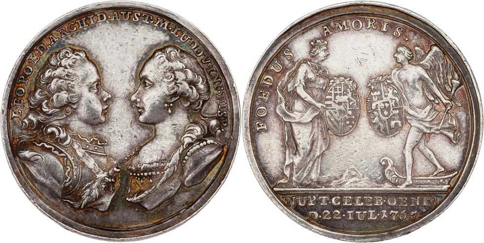 Wideman - AR svatební jeton 22.VII.1765 - portréty proti sobě, opis / alegor.postavy se znaky na štítech a písmo, Sign., 28mm, 8.386g, M.1946, H.3238, patina