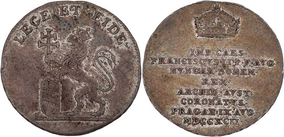 Menší jeton na korunovaci v Praze 9.8.1792 - stojící lev se znakem a křížem, opis / koruna a 8-řádk.nápis, Ag 20mm, 2.188g, Nov.H.4b, ČS.1438, dr.hr., patina