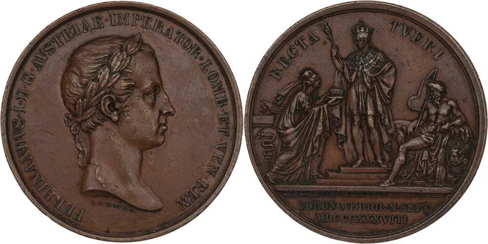 Roth - AE medaile na korunovaci v Miláně 1838 - hlava zprava, opis/ císař přijímá hold Lombardie a Benátek, písmo, 44mm, NOv.G.2c, M.2581, dr.hr.,dr.rys., patina