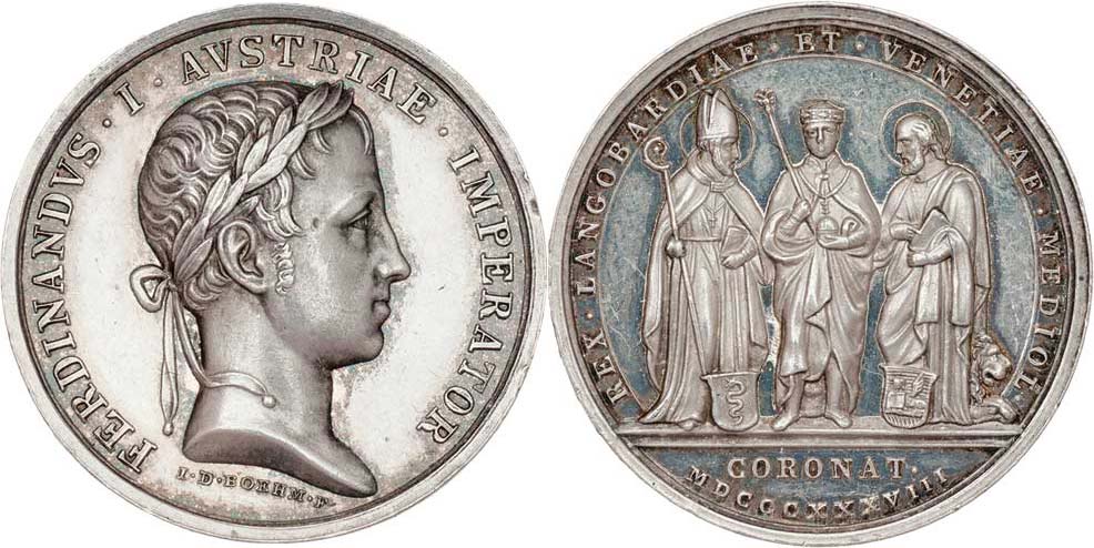 Boehm - AR medaile na korunovaci v Miláně 1838 - hlava zprava, opis / císař mezi dvěma světci, písmo, 29mm, 17.556g, Nov.G.6a, P.6/10, M.2582, dr.hr.,rysky