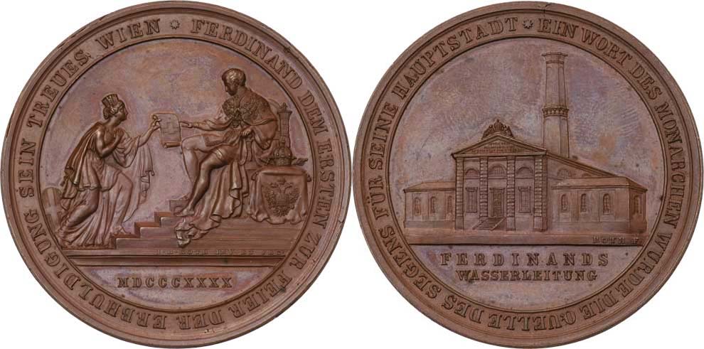 Roth - dokončení Ferdinandovy vodárny ve Vídni 1840 - Vindobona předává plány císaři, opis/ vodárna, písmo, Sign., měď 51mm, 61.539g, M.2593, Haus.44, patina