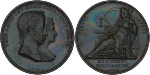 Cossa - AE medaile na korunovaci v Miláně 1838 - dvojportrét zleva, opis / sedící Justicia, opis a nápis, 64mm, 64.183g, Nov.J.1b, krásná patina