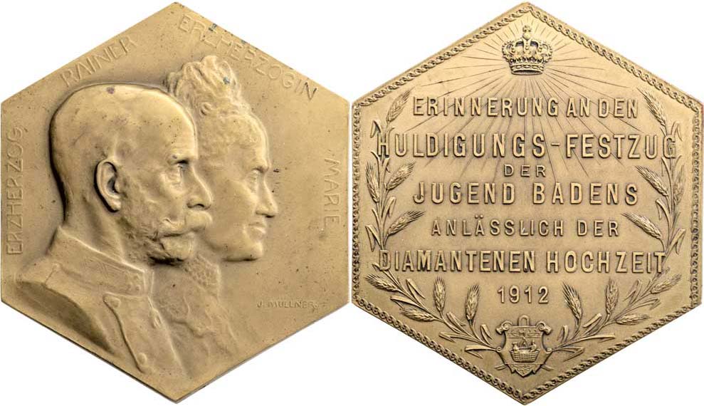 Müllner - AE plaketa na diamantovou svatbu 1912 - dvojportrét zprava, opis / korunka, znak a nápis ve věnci, Sign., patin. šestiúhelník 60x68 mm, 79.115g
