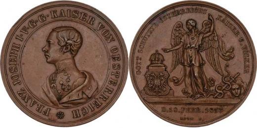 Roth - AE medaile na záchranu při atentátu 1853 - poprsí zleva, opis/ anděl strážný, znak, meč obtočený hadem, písmo, 38mm, 28.048g, H.3760(AR), M.2666, pat.