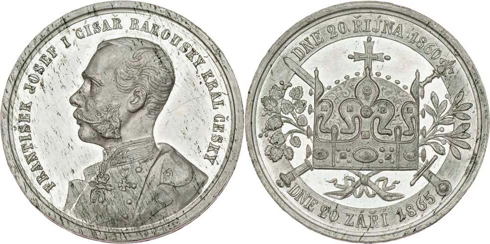 Seidan - na paměť ústavních zákonů z let 1860 a 1865 - poprsí zleva, český opis / král.koruna, žezlo, meč, vavříny a český opis, Sign., cín 34 mm