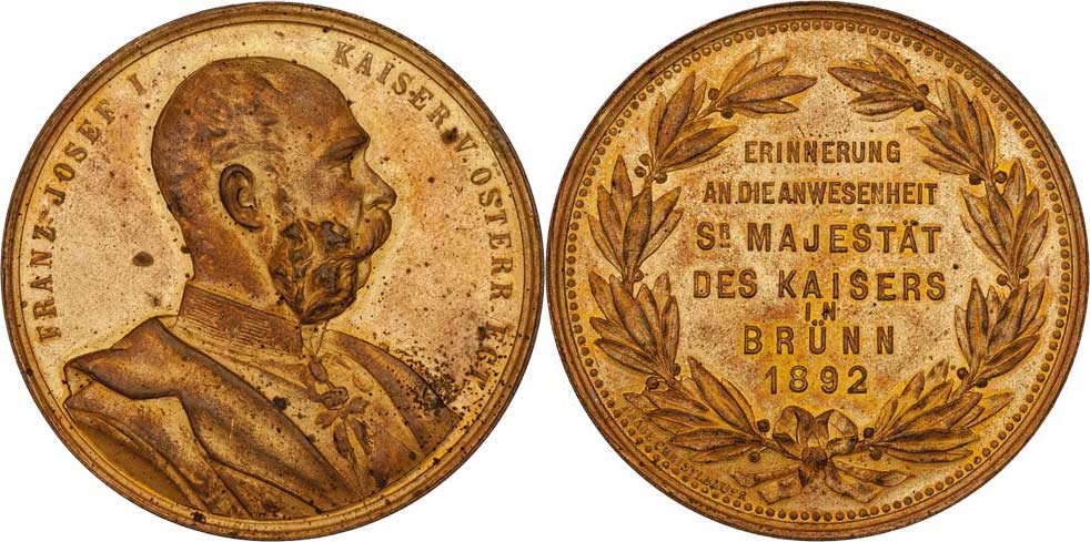 Tautenhayn a Christlbauer - návštěva v Brně 1892 - poprsí zprava, něm.opis / 7-řádk. něm.nápis ve věnci, Sign., zlac.bronz 36 mm, nep.skvrnky, patina, téměř