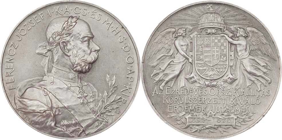 Gerl/Reisner/KB - na uherské milenium 1896 - poprsí zprava, ratolest, opis / andělé drží uherský znak, 4-řádk.nápis, Sign., Ag 38mm, 35.900g, nápis na hraně